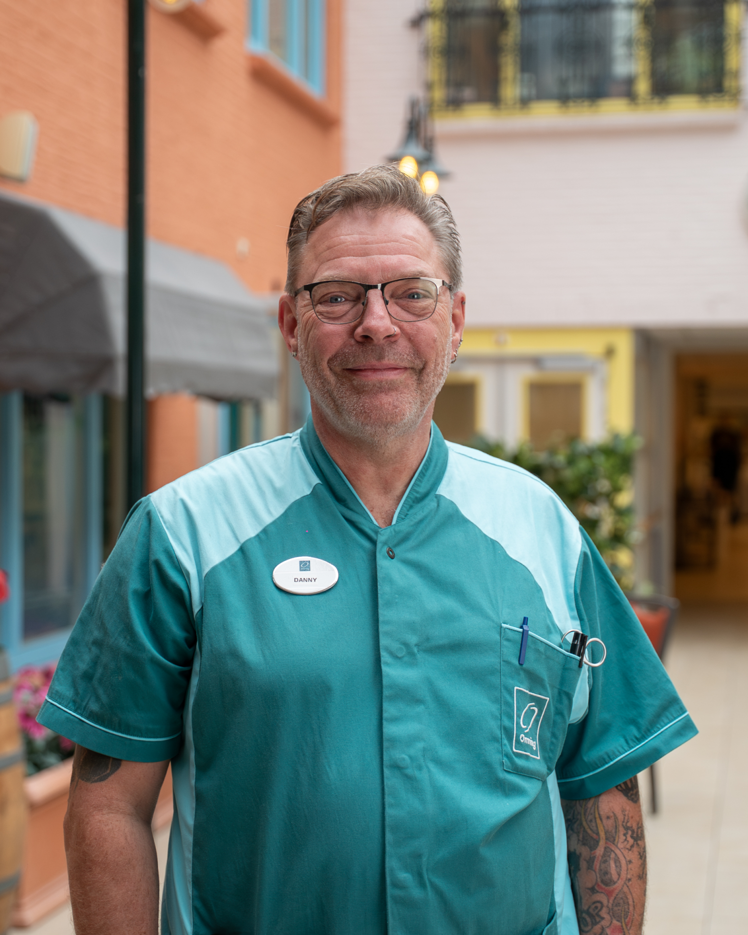 Inmiddels heeft Danny zich bijgeschoold tot Helpende Plus. ‘Ik merkte dat ik graag nog iets meer wilde doen, dus inmiddels ben ik “gediplomeerd billenwasser”’, zegt hij lachend. ‘En toegegeven; leren gaat niet meer zo makkelijk op mijn leeftijd. Maar vanuit Omring krijg je alle steun en ook je collega’s helpen je. Natuurlijk moet je wel tegen een beetje kritiek kunnen; je bent tenslotte nog aan het leren. Ik leer elke dag nog bij, en dat is alleen maar ontzettend leuk.’