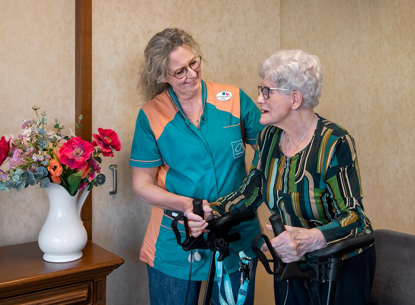 Met haar verhuizing naar het eiland kwam ook een banenswitch. ‘Ik moest stoppen bij mijn werk in Naarden en dat vond ik oprecht jammer, want ik had het daar erg naar mijn zin. Ik ging op zoek naar zorgfuncties op Texel en dan kun je eigenlijk niet om Omring heen. Omring levert verreweg de meeste zorg, dus besloot ik als Verzorgende IG bij Omring te solliciteren. Dat lukte. Ik kon aan de slag op de afdeling psychogeriatrische zorg (PG) van locatie Hollewal.’